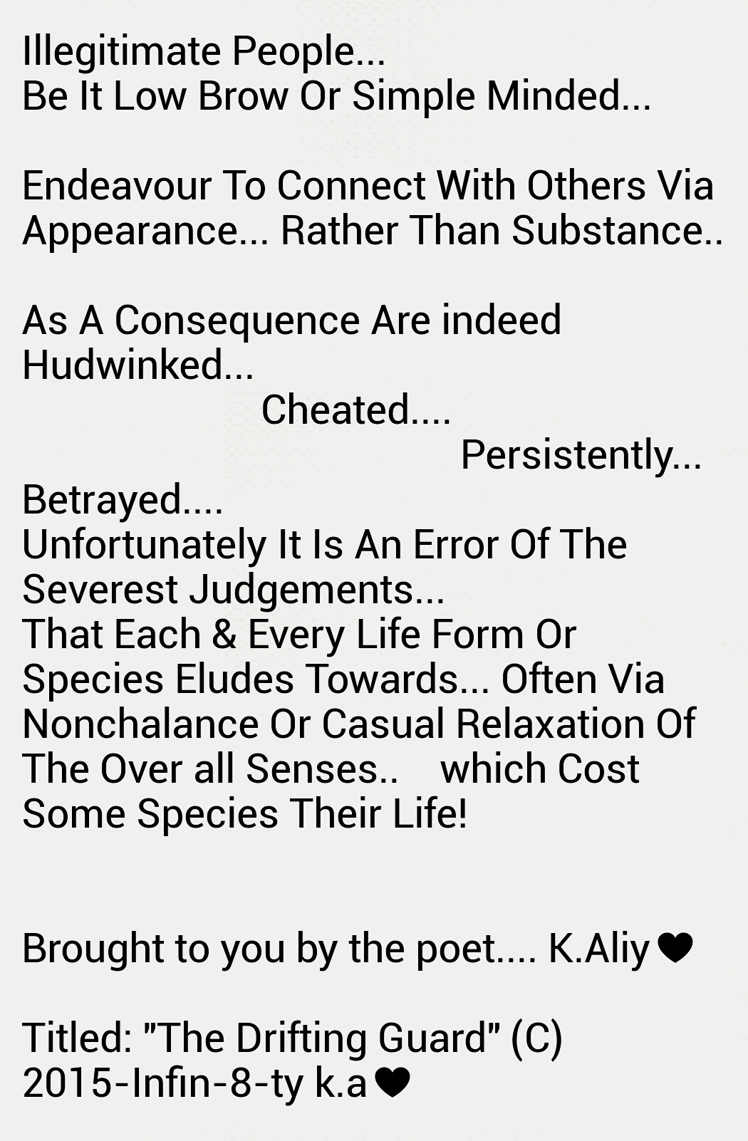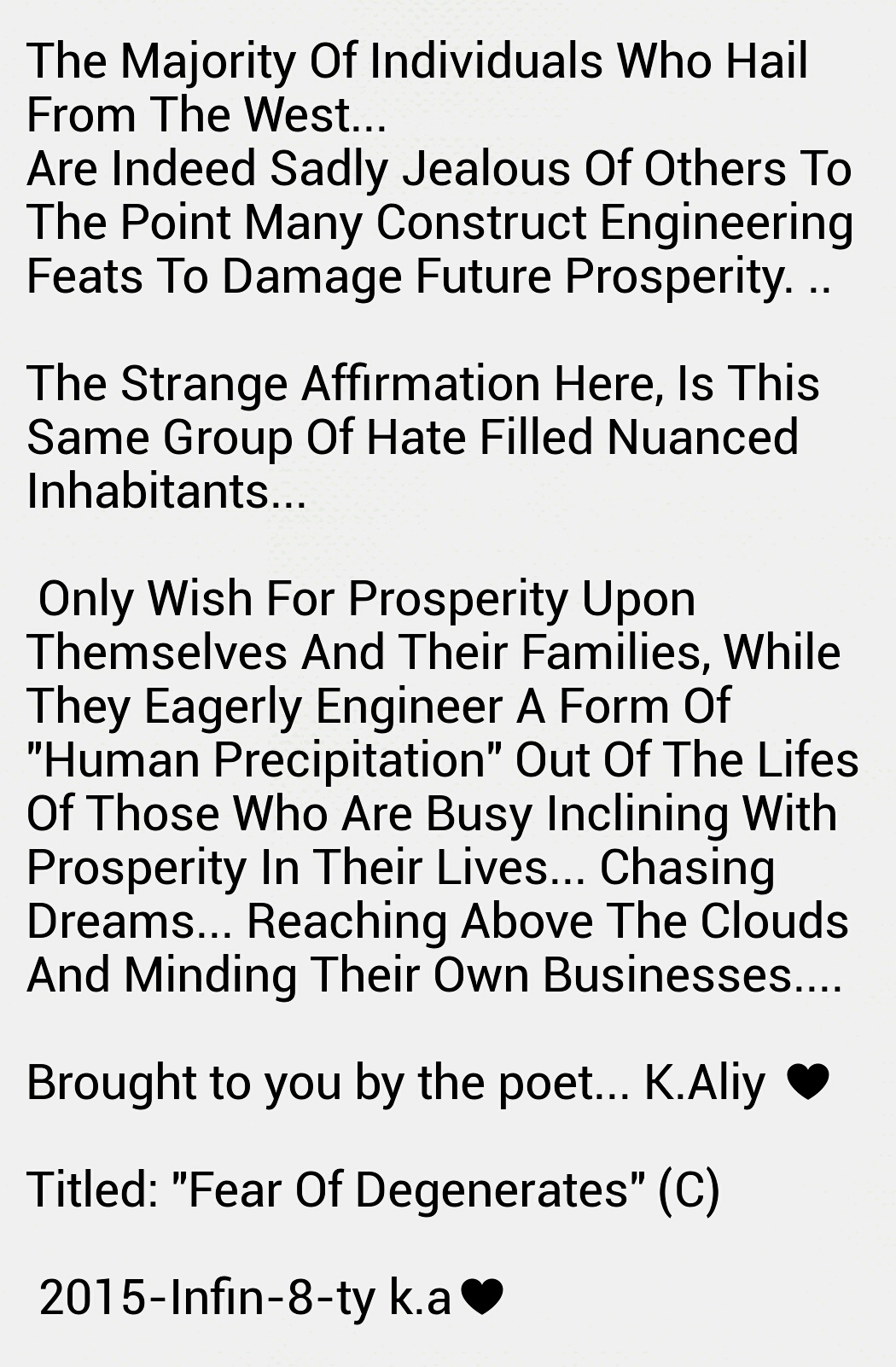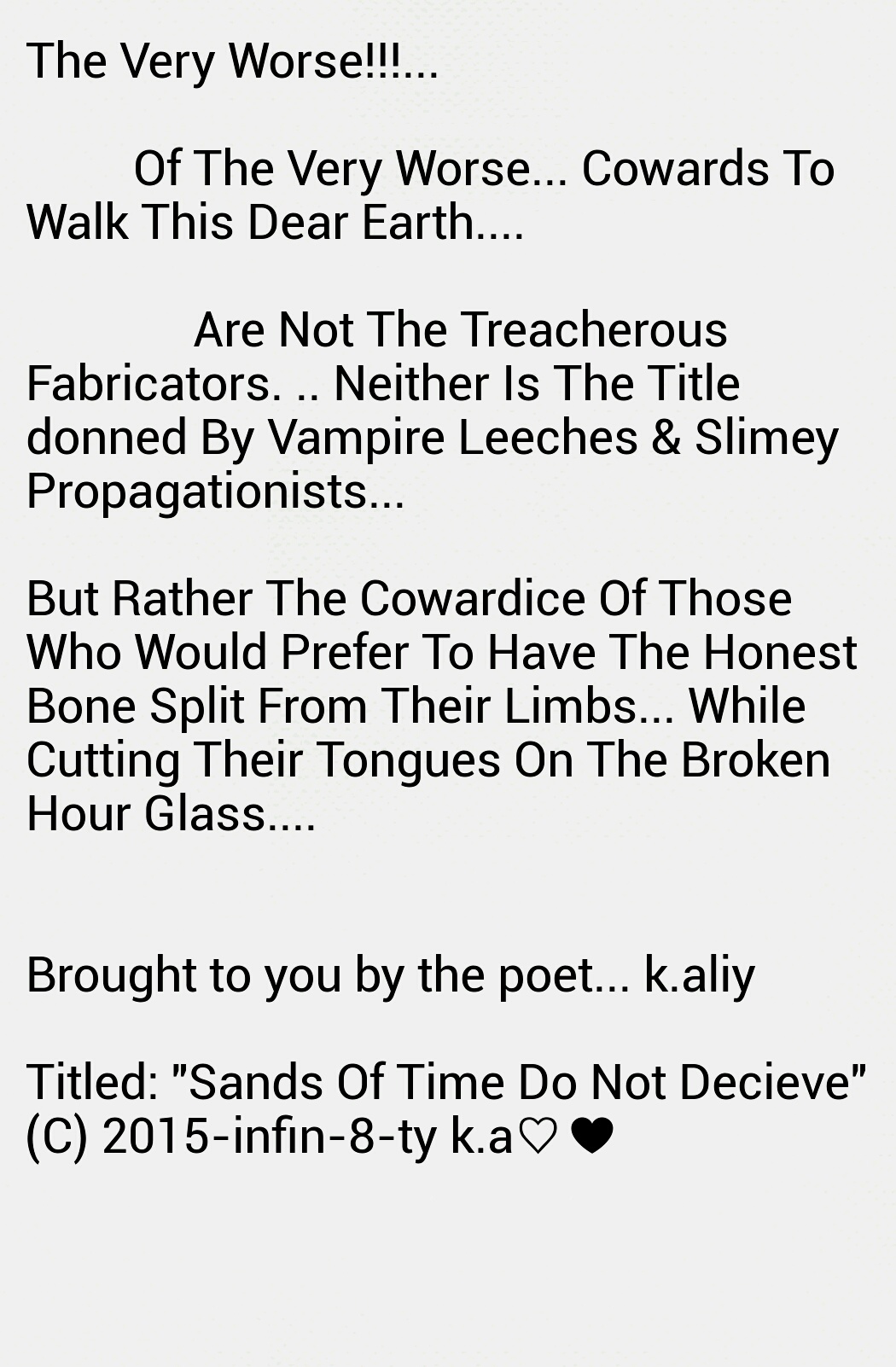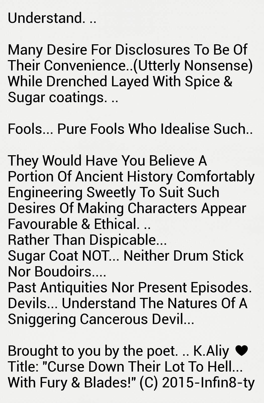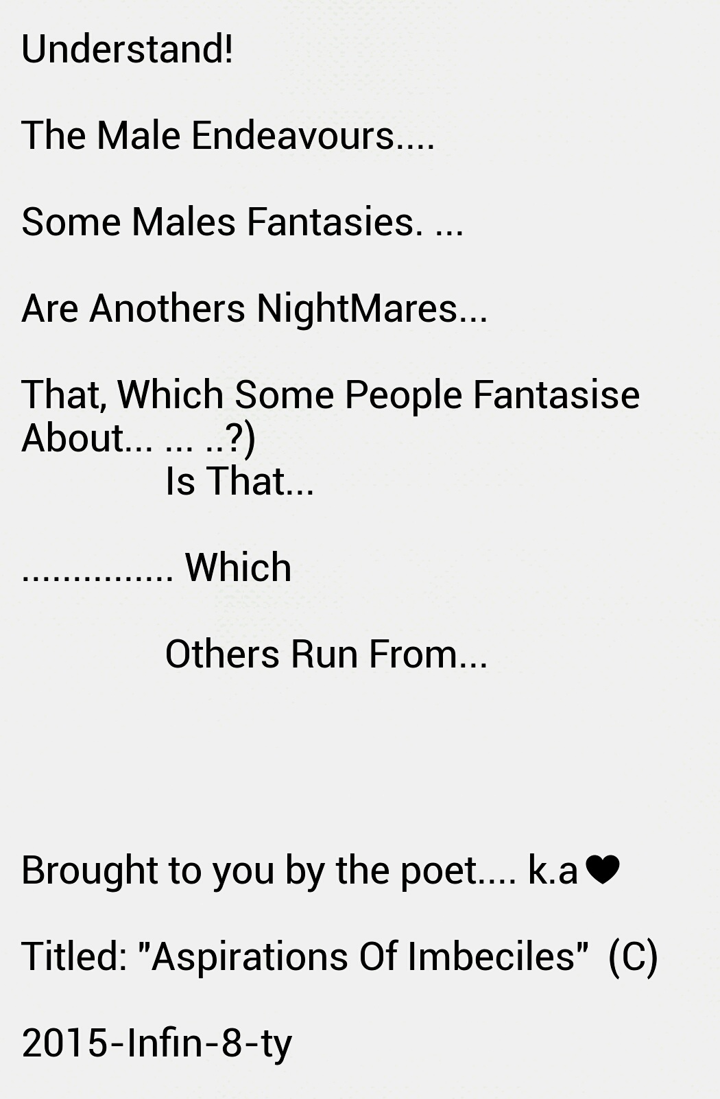 Such as this wedging, which ever so slowly releases toxic fumes of bilious misery into the atmospheric metrication of the zone inhabited and effected by this history. All who exist and who have fought and searched for shelter in thus vicinity, often lose against any sustenance of victory and longevity of harmony!