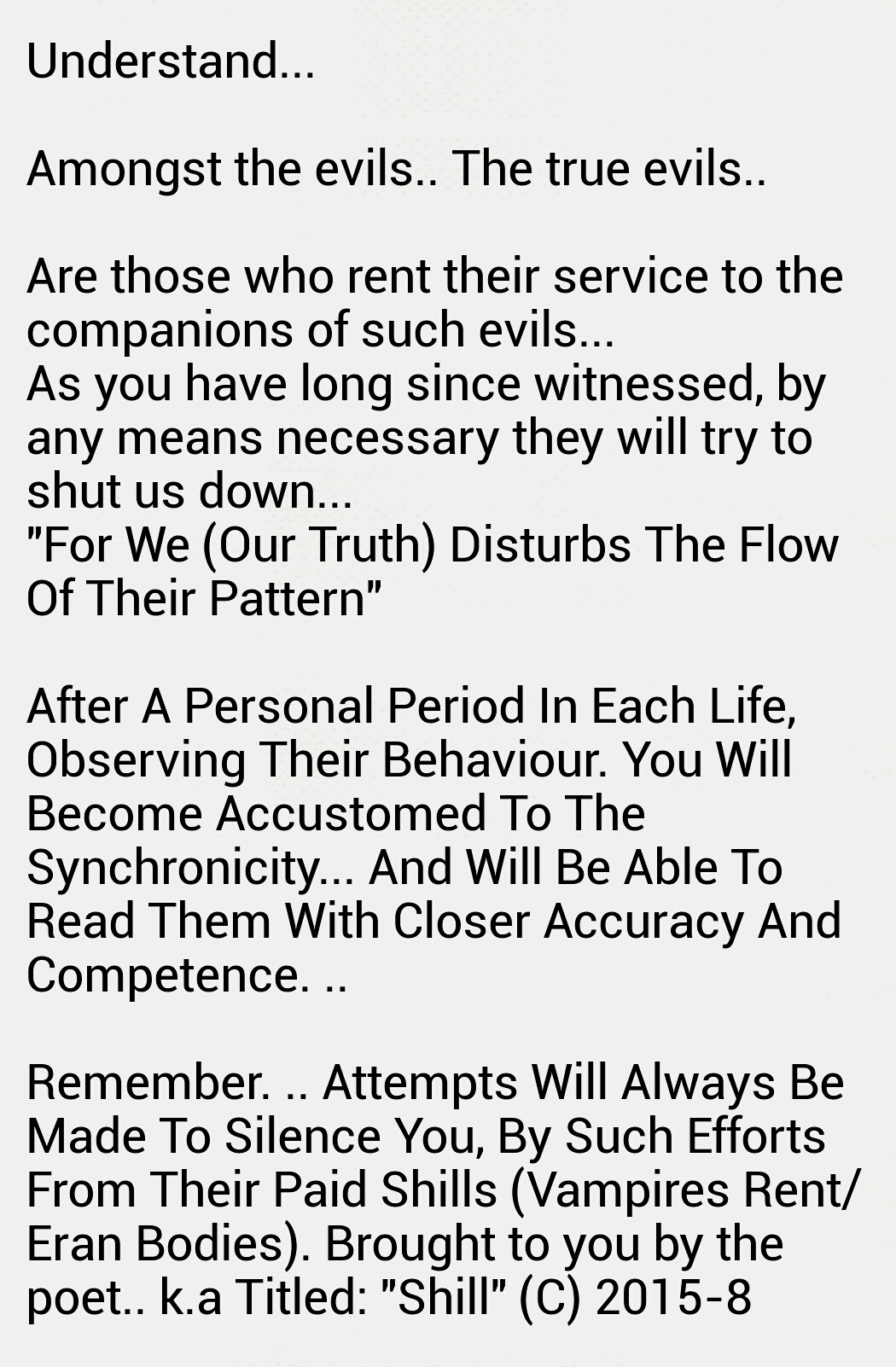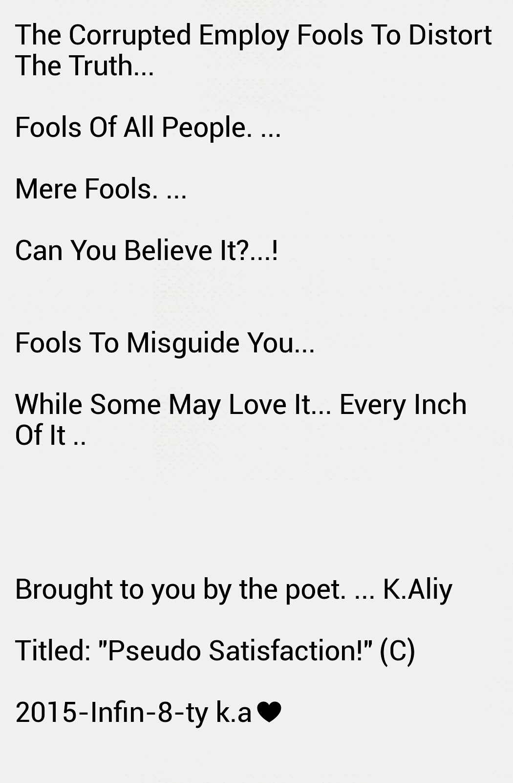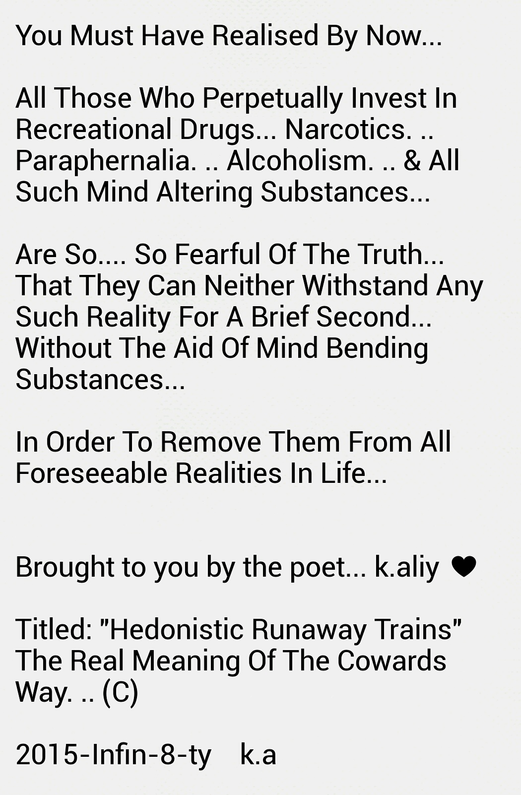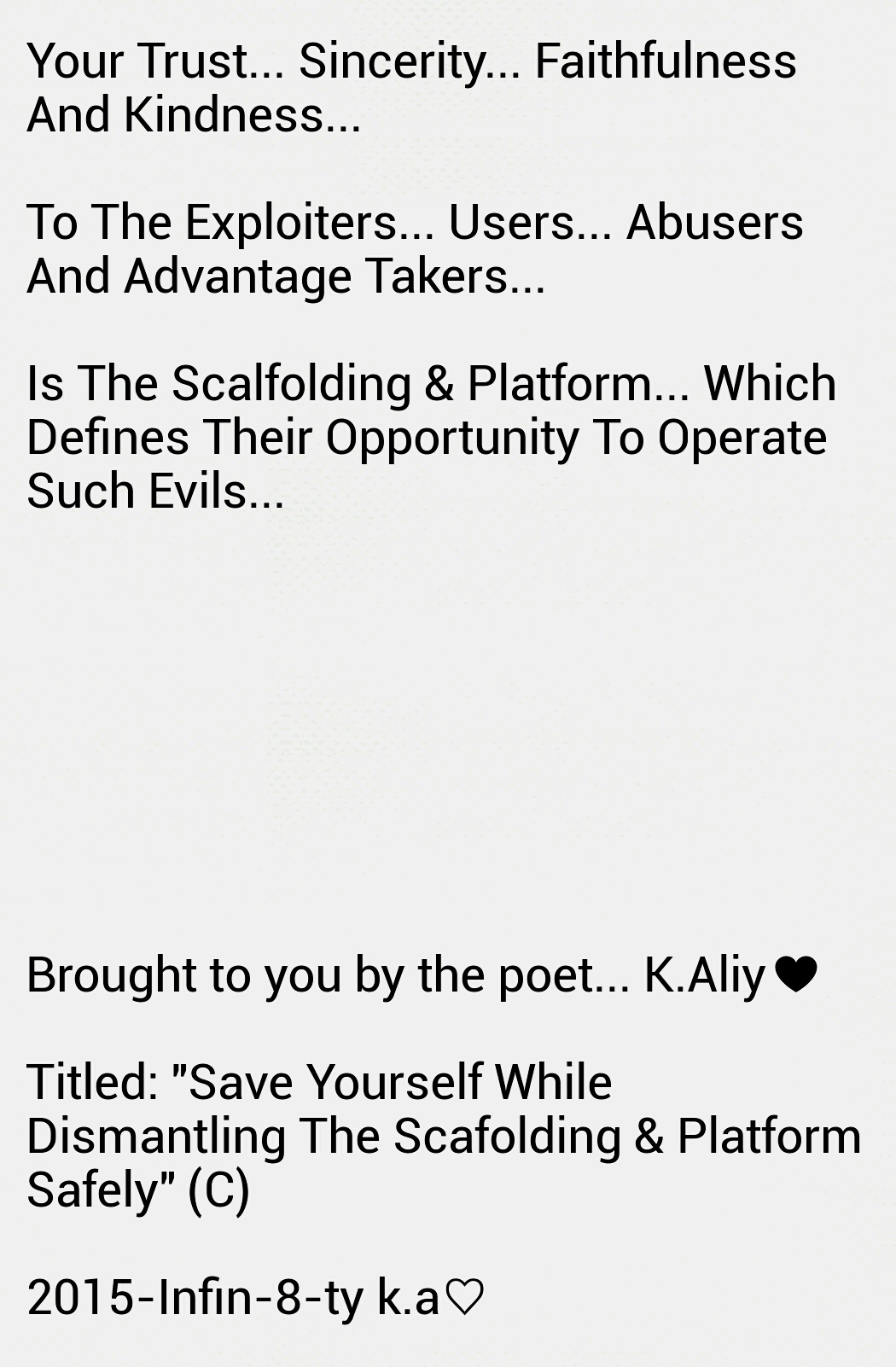 Such as this wedging, which ever so slowly releases toxic fumes of bilious misery into the atmospheric metrication of the zone inhabited and effected by this history. All who exist and who have fought and searched for shelter in thus vicinity, often lose against any sustenance of victory and longevity of harmony!